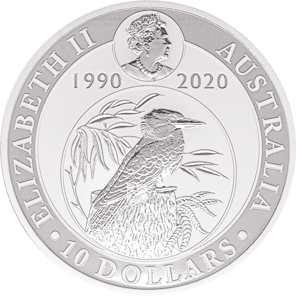 For 2020, the obverse of this substantial 10 oz coin features a kookaburra perched on a tree stump, a representation of the same design which featured on the 1990 coin. The obverse also features the dates 1990 - 2020.