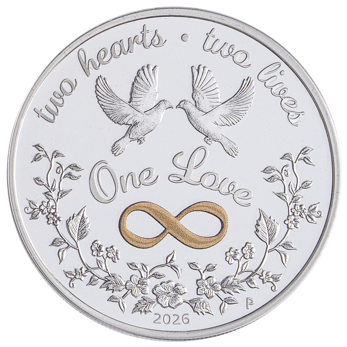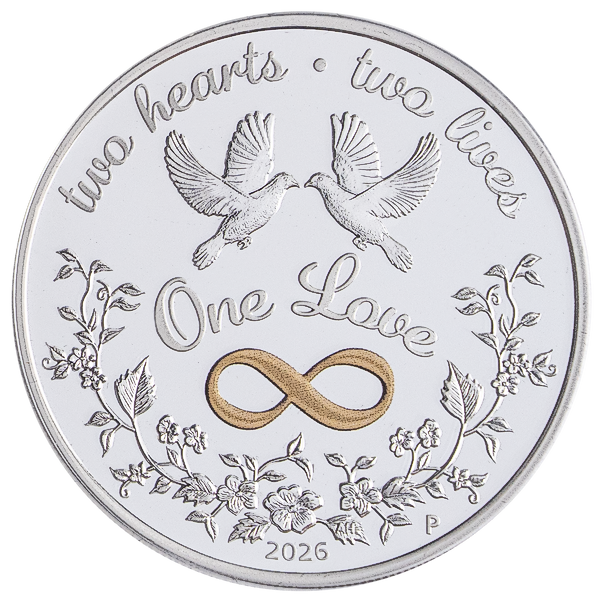 The reverse of the coin depicts two doves, a colored infinity symbol and a stylized pattern of flowers and leaves. Also included in the design is the inscription "Two hearts - two lives - one love" and The Perth Mint’s "P" mint mark.