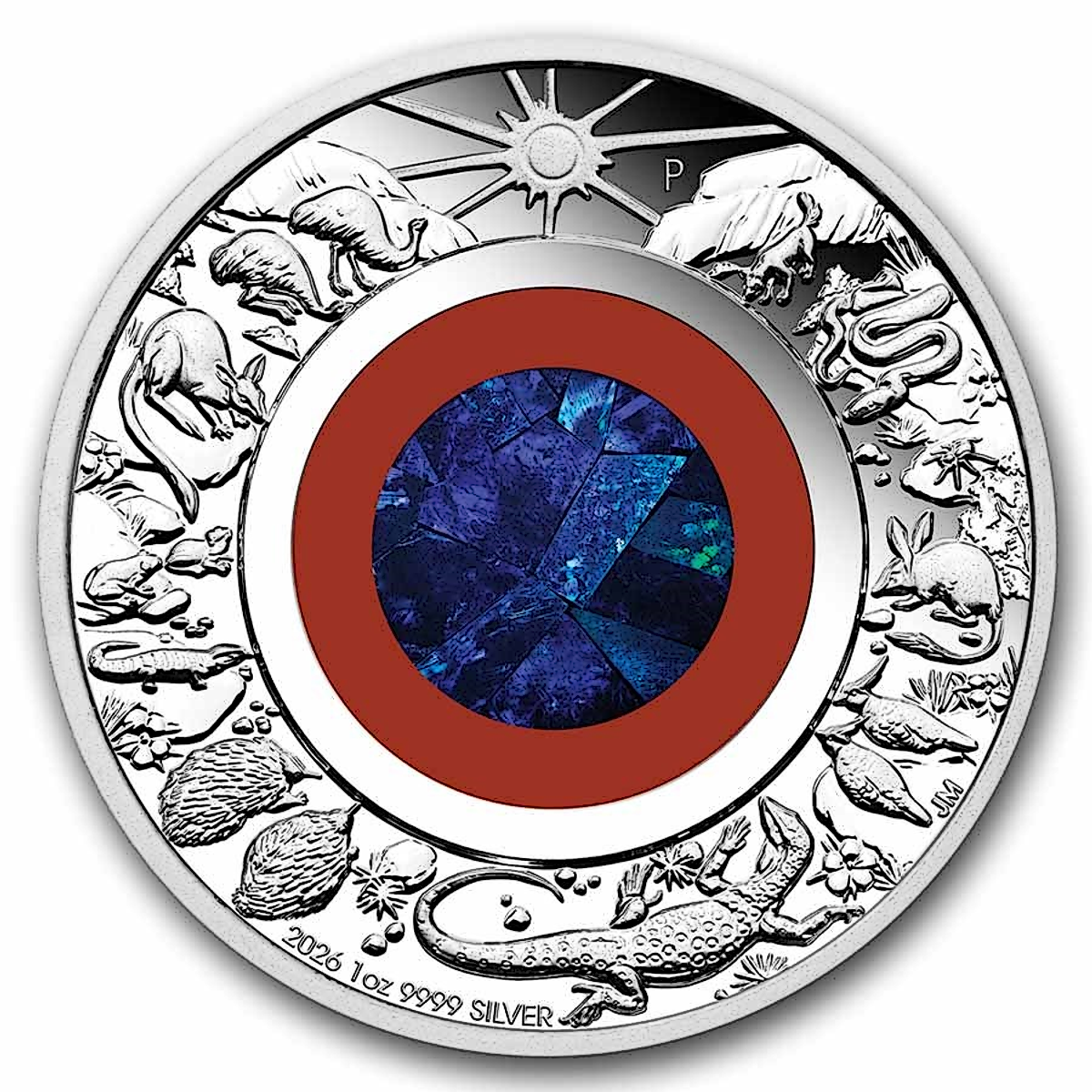 The coin's reverse features a round opal insert, which is Australia's national gemstone. Depicted clockwise is a sun with beaming rays, a dingo, a python, a wolf spider, a bilby, two spinifex pigeons, a perentie, two echidnas, a blue tonged skink, two desert tree frogs, a rock wallaby and two emus. Also in the design re representations of diverse fauna and rock formations, along with The Perth Mint's 'P' mint mark and the coin's weight & fineness, purity and the 2026-year date.