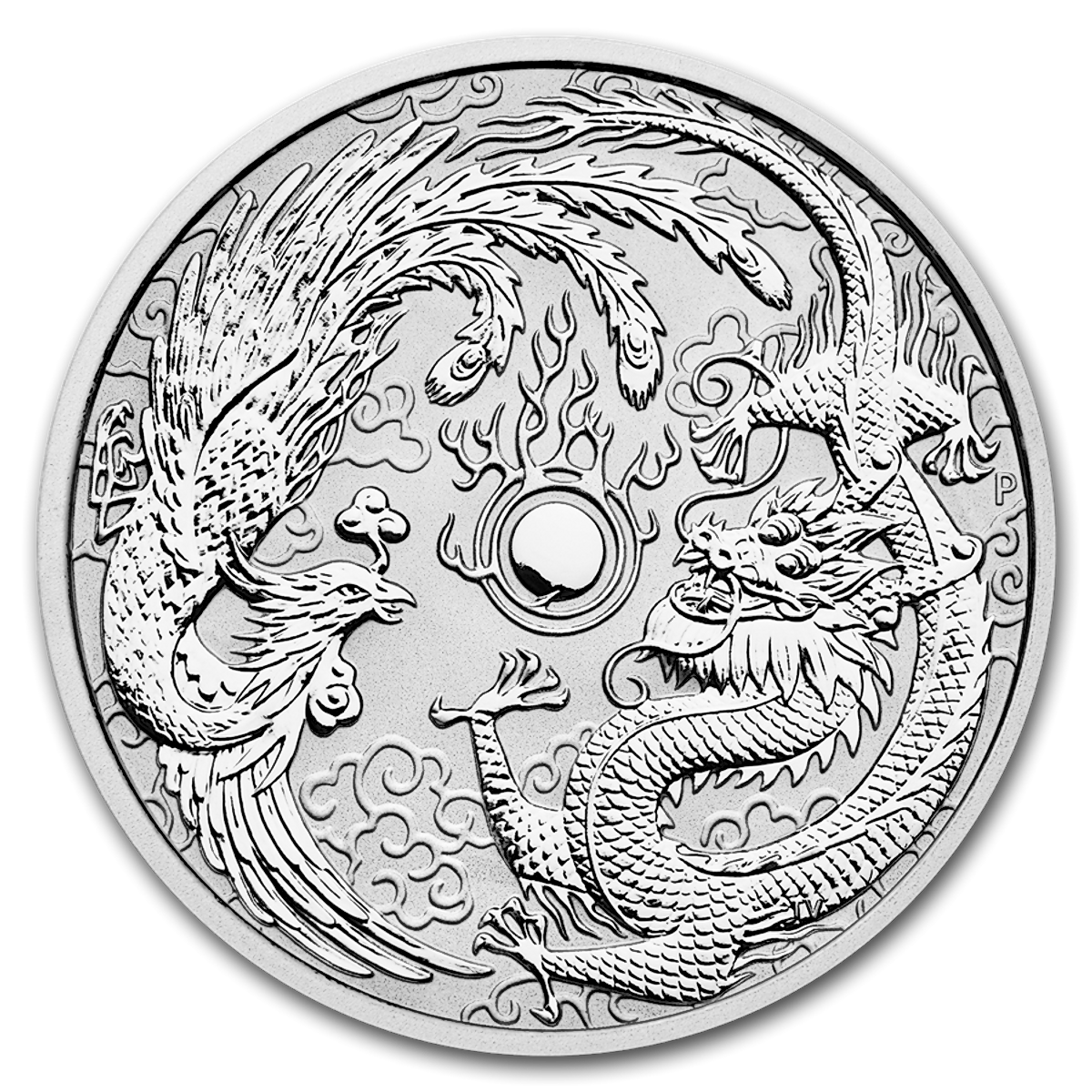The reverse features a dragon on the right and a phoenix on the left, both artistically curving around the rim of the coin.