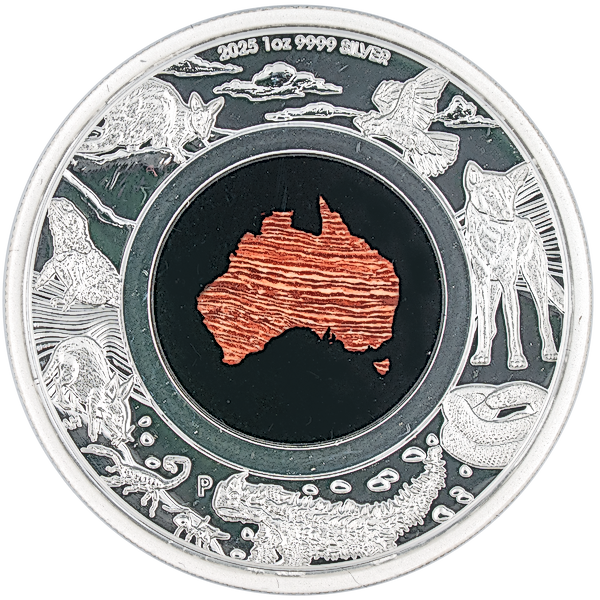 Celebrating Australia’s iconic desert species, the coin depicts (clockwise from top) a cockatoo, a dingo, a taipan snake, a thorny devil, a desert ant, a scorpion, a bilby, a bearded dragon, and a rock wallaby. Also in the design are representations of the sky, sand and rocks, along with The Perth Mint’s ‘P’ mintmark and the coin’s weight, purity, and 2025 year-date.
