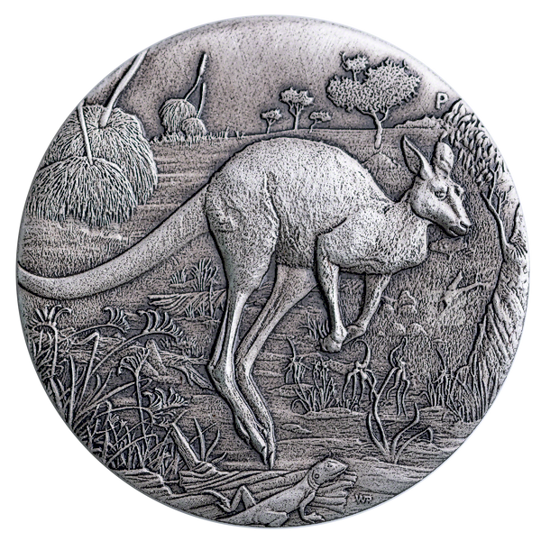 2 oz Antiqued Finished Silver Kangaroo minted by the Perth Mint.