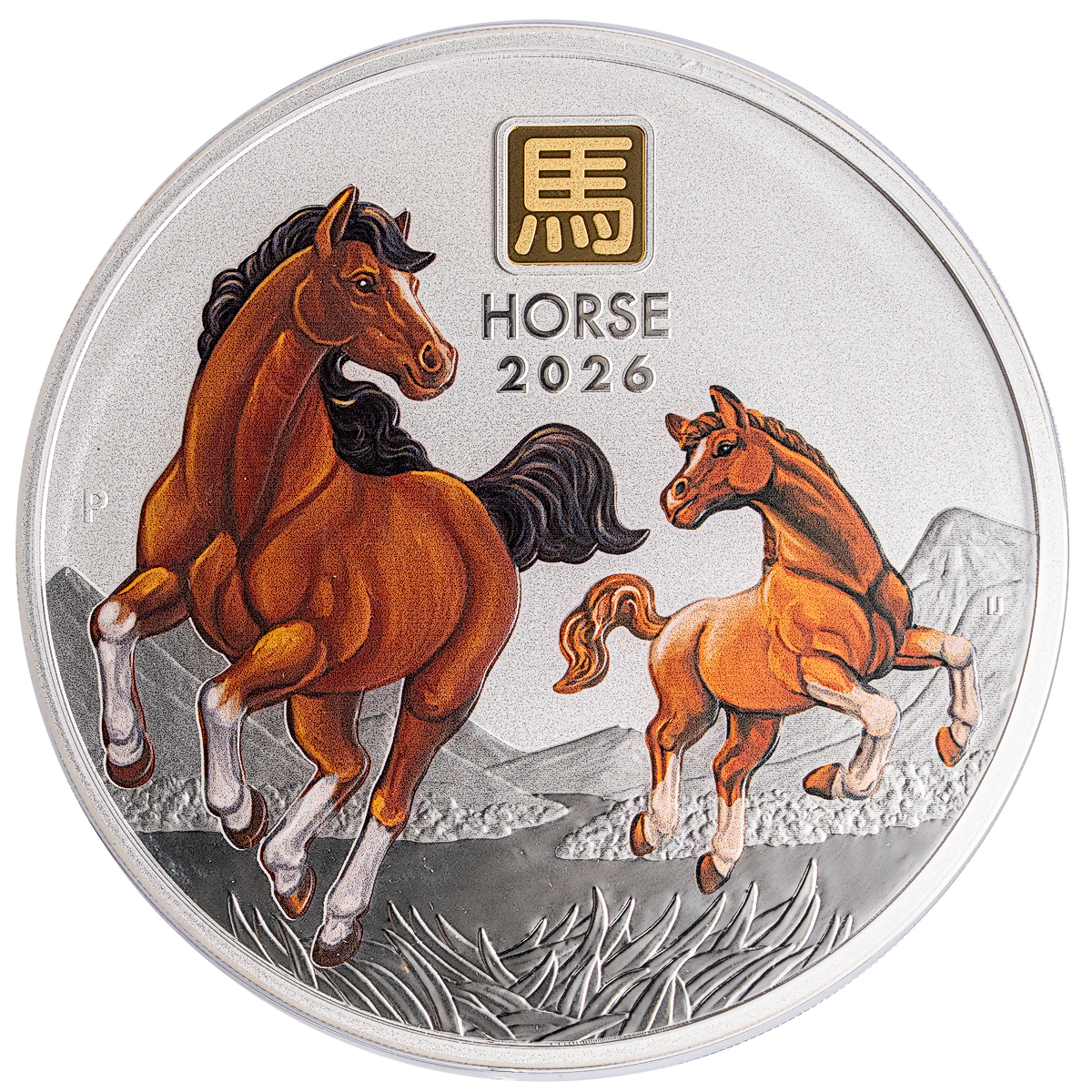 The coin’s coloured reverse portrays a majestic mare alongside her young foal, both depicted with elegant manes in a striking galloping stance. The pair mirrors one another's charm in a face-to-face interaction. The background includes towering mountains and the lush serenity of grasslands. Also included in the design is a 1 gram pure gold privy insert portraying the Chinese character for ‘Horse’, the inscription ‘HORSE 2026’, and The Perth Mint’s ‘P’ mintmark.