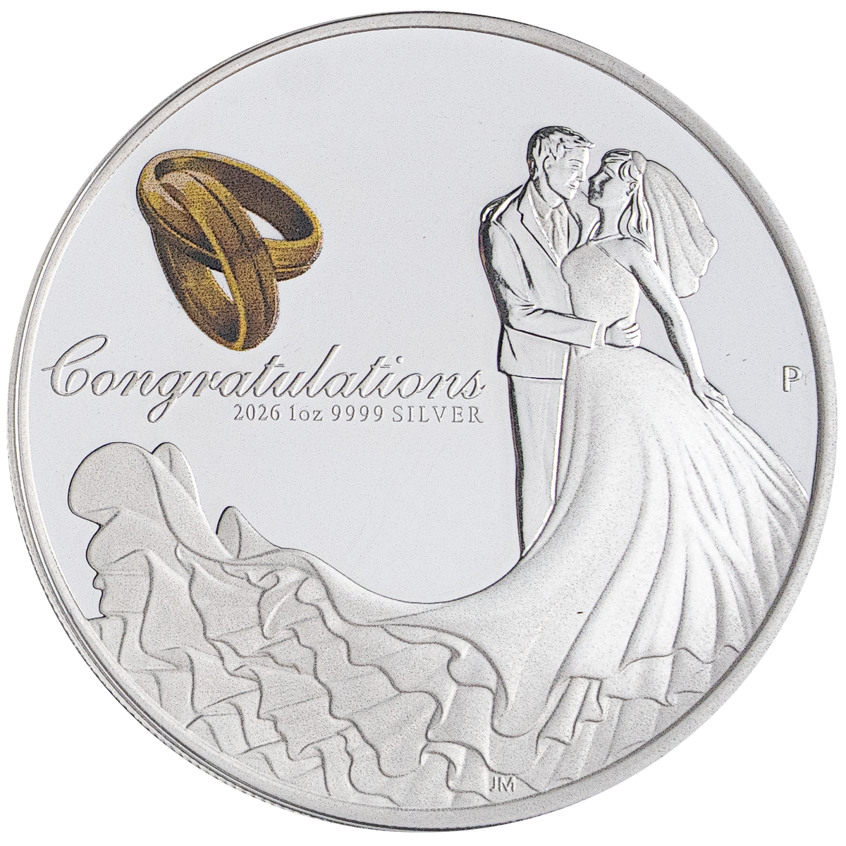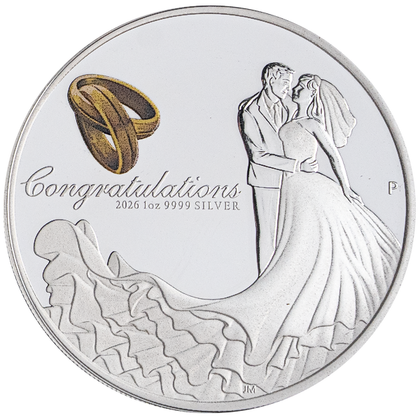 The coin, minted in .9999 purity, depicts a bride and groom embracing on their wedding day and two intertwined gold wedding bands. The design includes the inscription ‘Congratulations’, and The Perth Mint’s traditional ‘P’ mintmark.