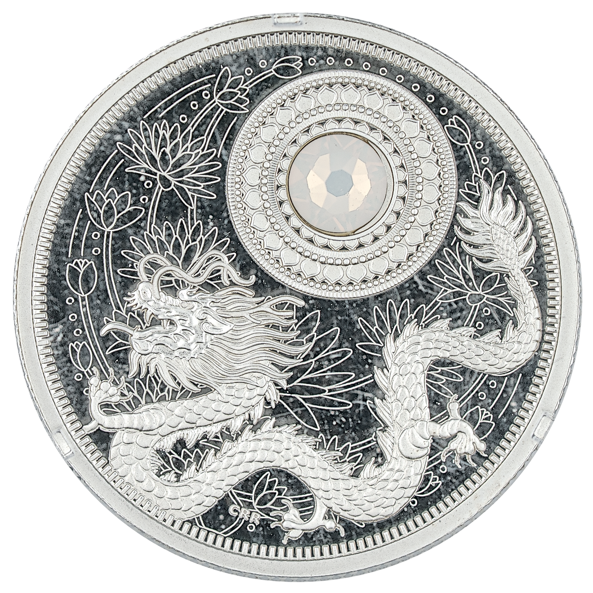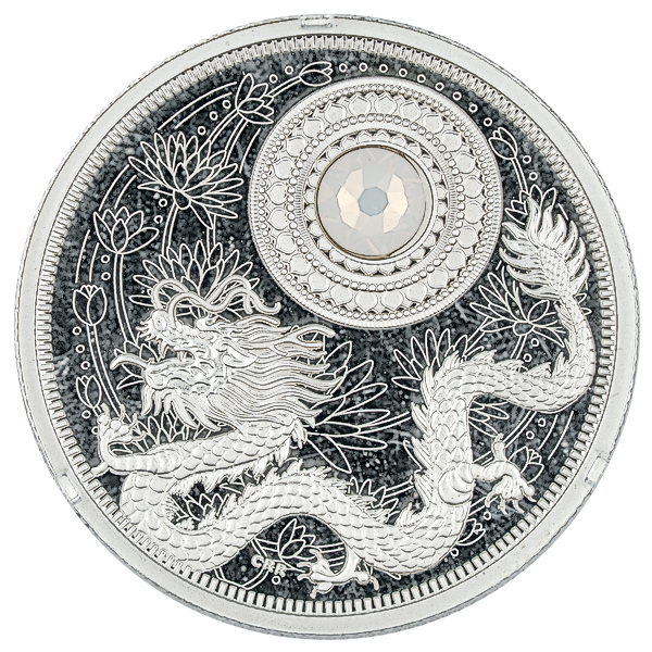 The reverse, designed by Three Degrees Creative Group, combines modern artistry with deep cultural symbolism. A finely engraved lotus motif spreads across the background, reimagined in a contemporary style yet still reflecting the flower’s timeless association with purity of heart and mind. At the center, a striking mid-relief dragon emerges in remarkable detail, symbolizing power, strength, and good fortune in Asian tradition. Above the dragon rests a classic circular motif, adorned with a Swarovski® crystal representing pearl, the birthstone for June, which is said to bring balance and joy to those born in the month.