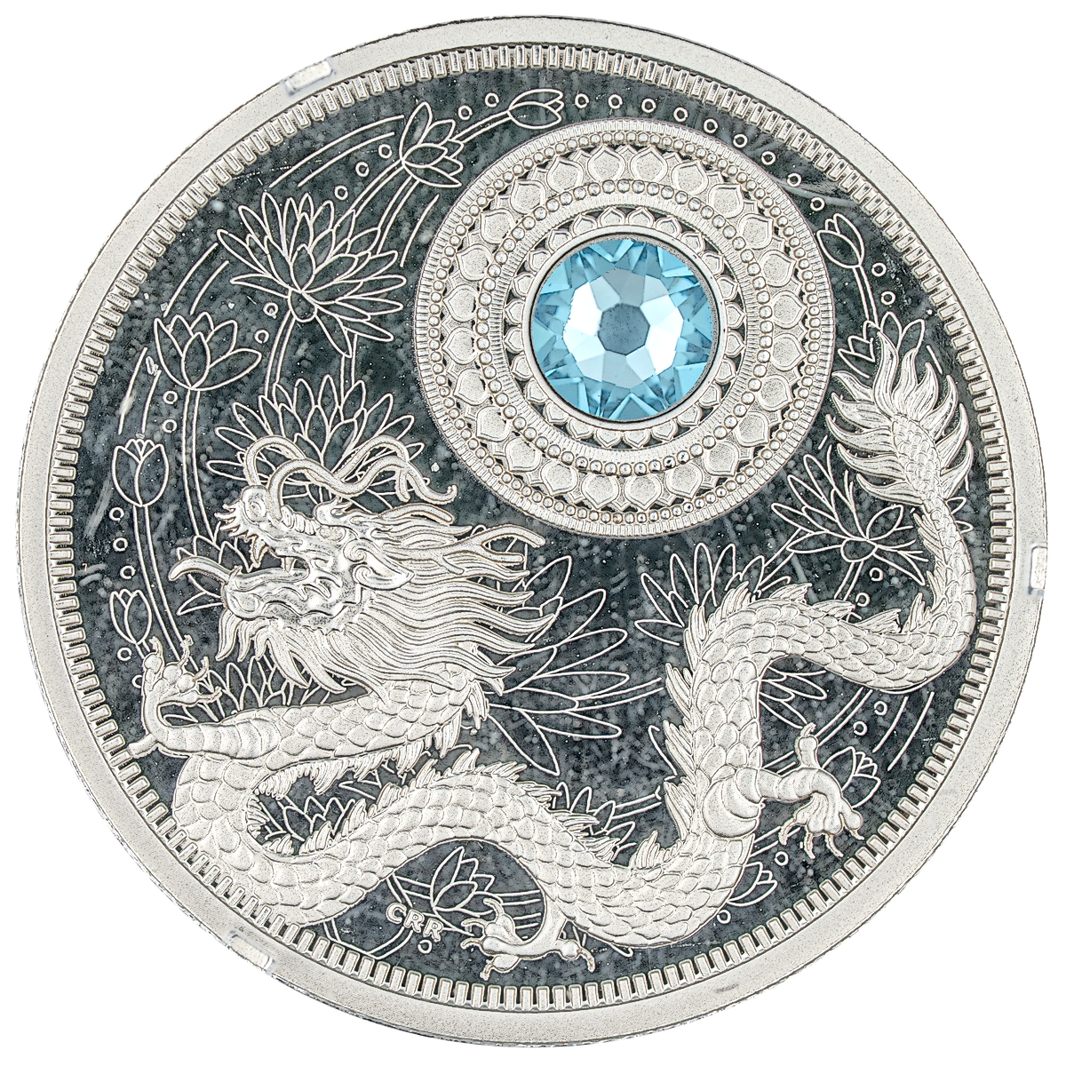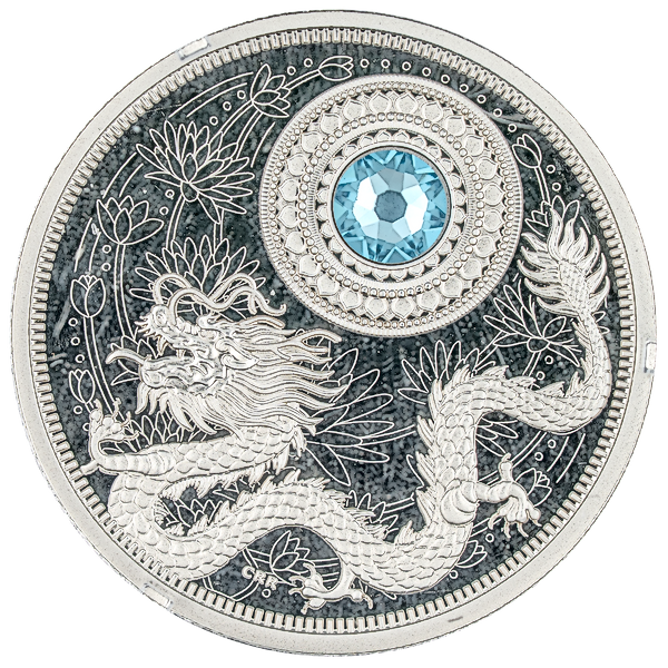 The reverse, designed by Three Degrees Creative Group, combines modern artistry with deep cultural symbolism. A finely engraved lotus motif spreads across the background, reimagined in a contemporary style yet still reflecting the flower’s timeless association with purity of heart and mind. At the center, a striking mid-relief dragon emerges in remarkable detail, symbolizing power, strength, and good fortune in Asian tradition. Above the dragon rests a classic circular motif, adorned with a Swarovski® crystal representing garnet — the birthstone of March, believed to inspire courage and promote well-being.