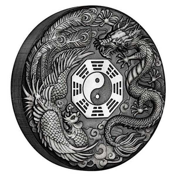 2 oz Antiqued finished Dragon and Phoenix coin produced by Perth Mint.