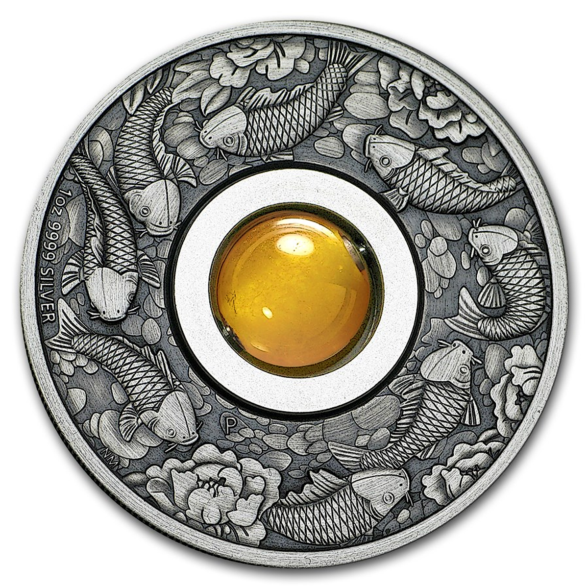 The reverse features eight koi fish swimming beneath peonies and encircling a rotating yellow topaz charm. Eight is considered the most propitious number in Chinese culture.
