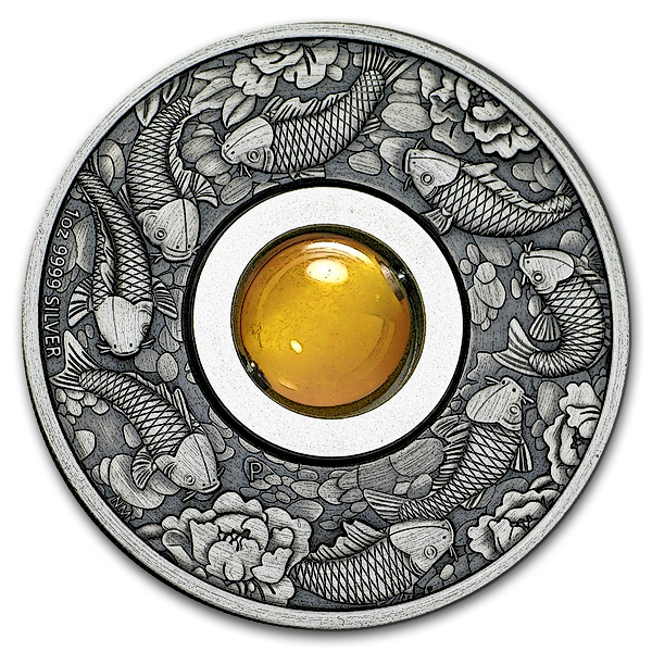 1 oz antiqued finish coin produced by the Perth Mint depicting the popular Koi Fish