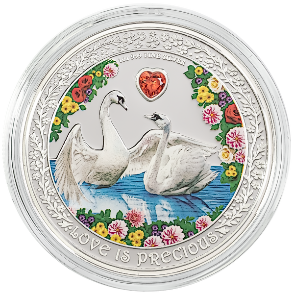 The obverse displays two Swans representing lovers, with a red, heart-shaped cubic zirconia between them. Surrounding the love birds is a myriad of delightful flowers. The inscription "Love is Precious" is engraved into an ornate border design at the bottom.