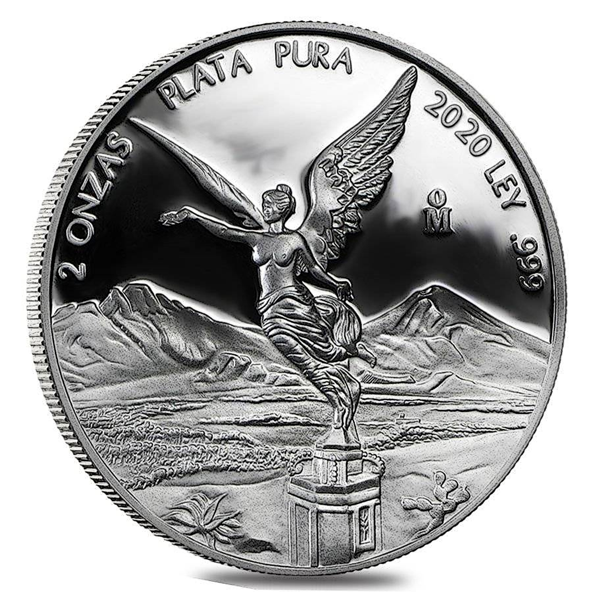 The reverse face of the 2 oz coin features the winged Angel of Independence in Mexico City against a background of the famous Mexican volcanoes Popocatépetl and Iztaccíhuatl.