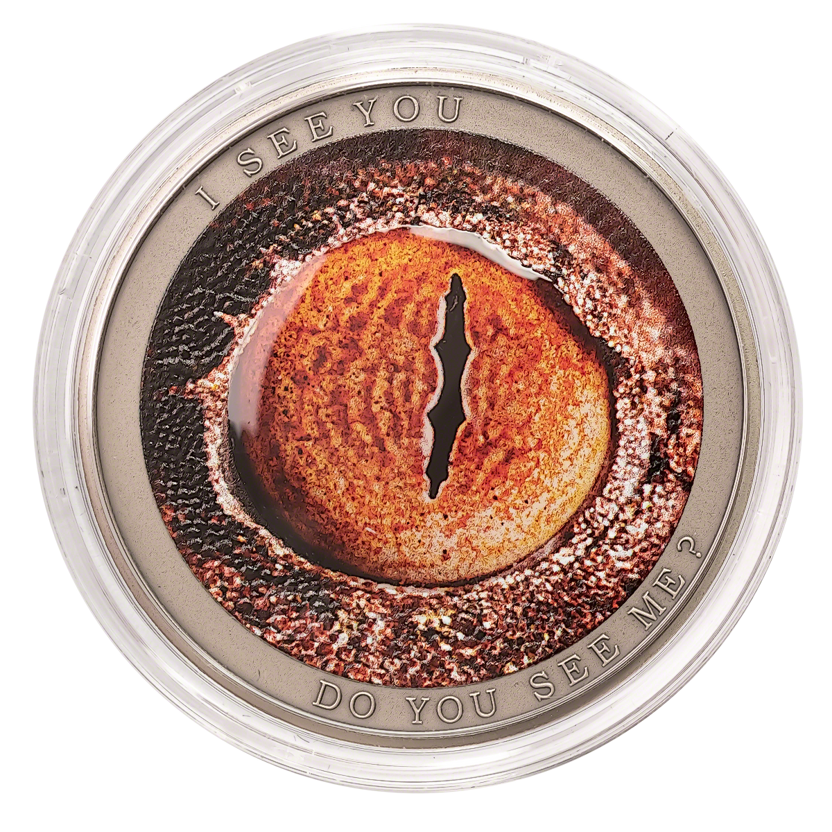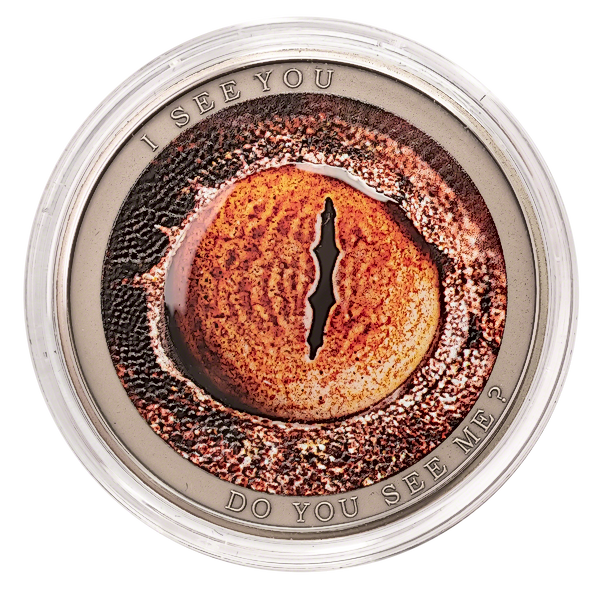 The eye was created using a special UV coating technology. The eye is convex with a mini relief, and the gecko appears to be staring at you. The inscriptions "I SEE YOU" and "DO YOU SEE ME?" – the coin's name – are all around the reverse.