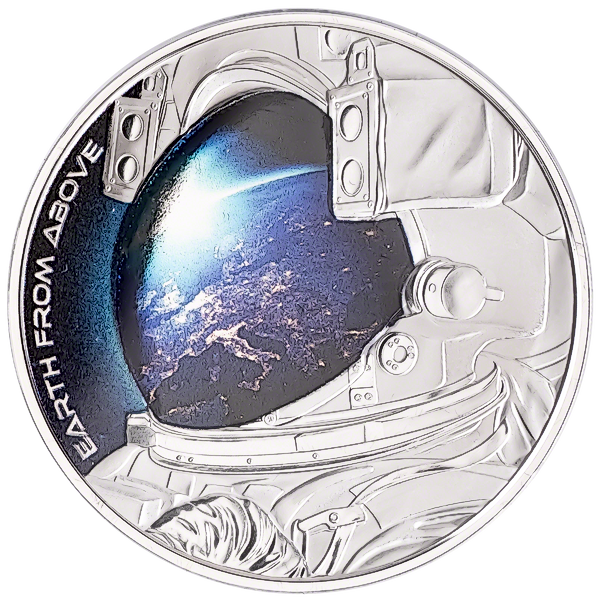 This out-of-this-world Proof quality design is all about perspective! A ‘helmet with a view’ gives us a rare glimpse of the Earth, revealing a whole new world from a rare and privileged vantage point – the reflection in an astronaut’s visor.