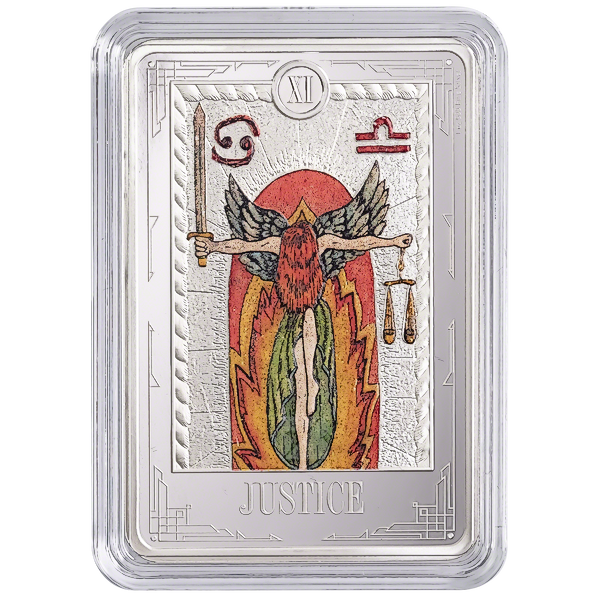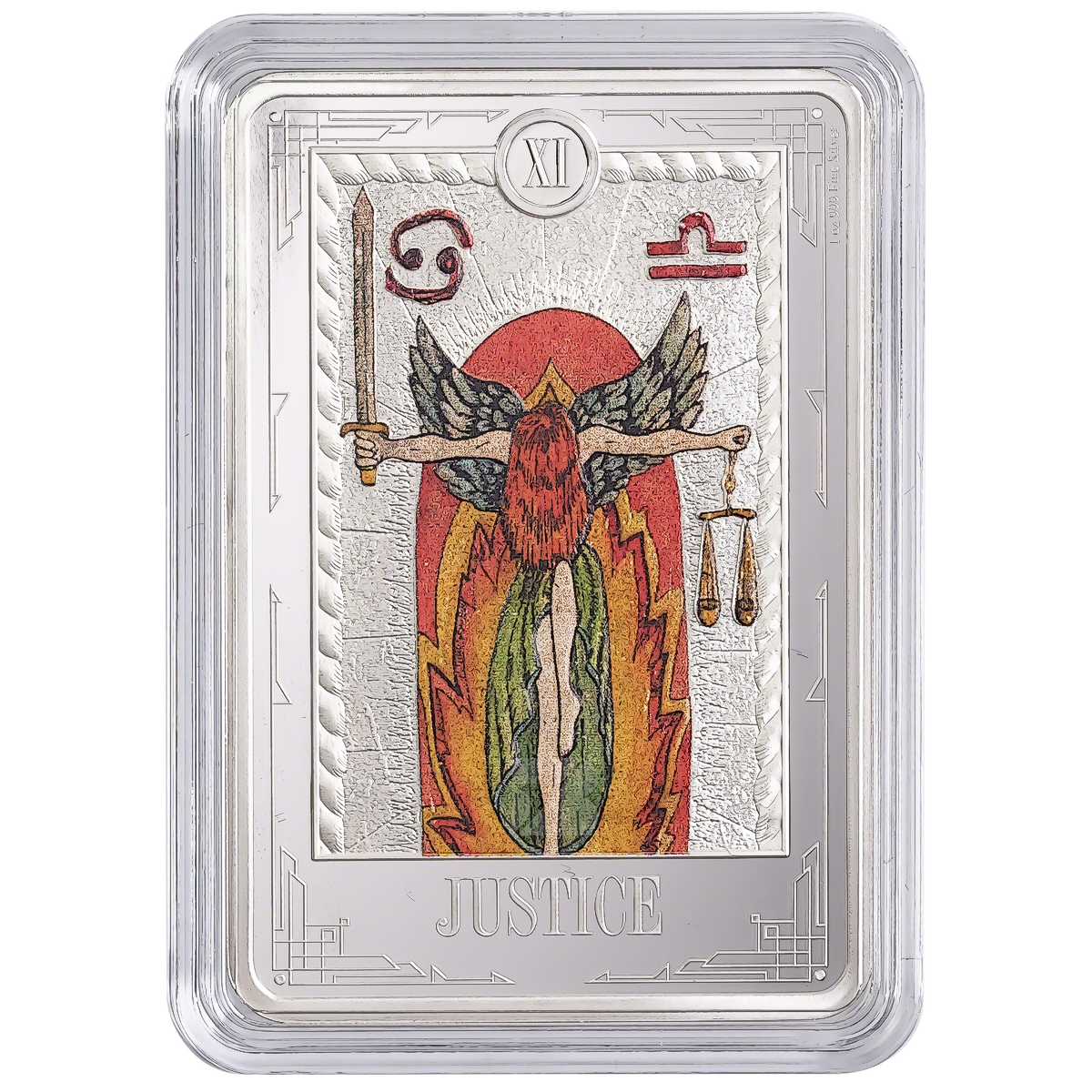 1 oz Silver Justice tarot card silver bar minted by New Zealand Mint.