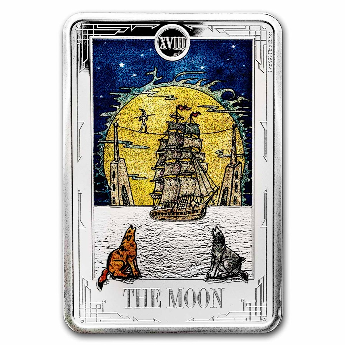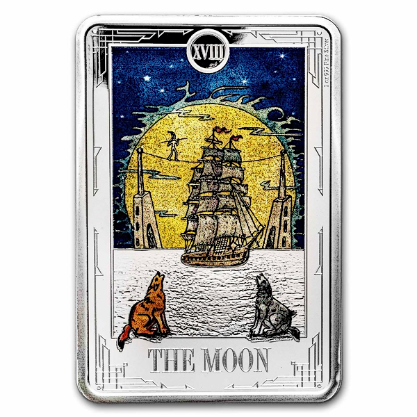 1 oz Silver The Moon tarot card silver bar minted by New Zealand Mint.