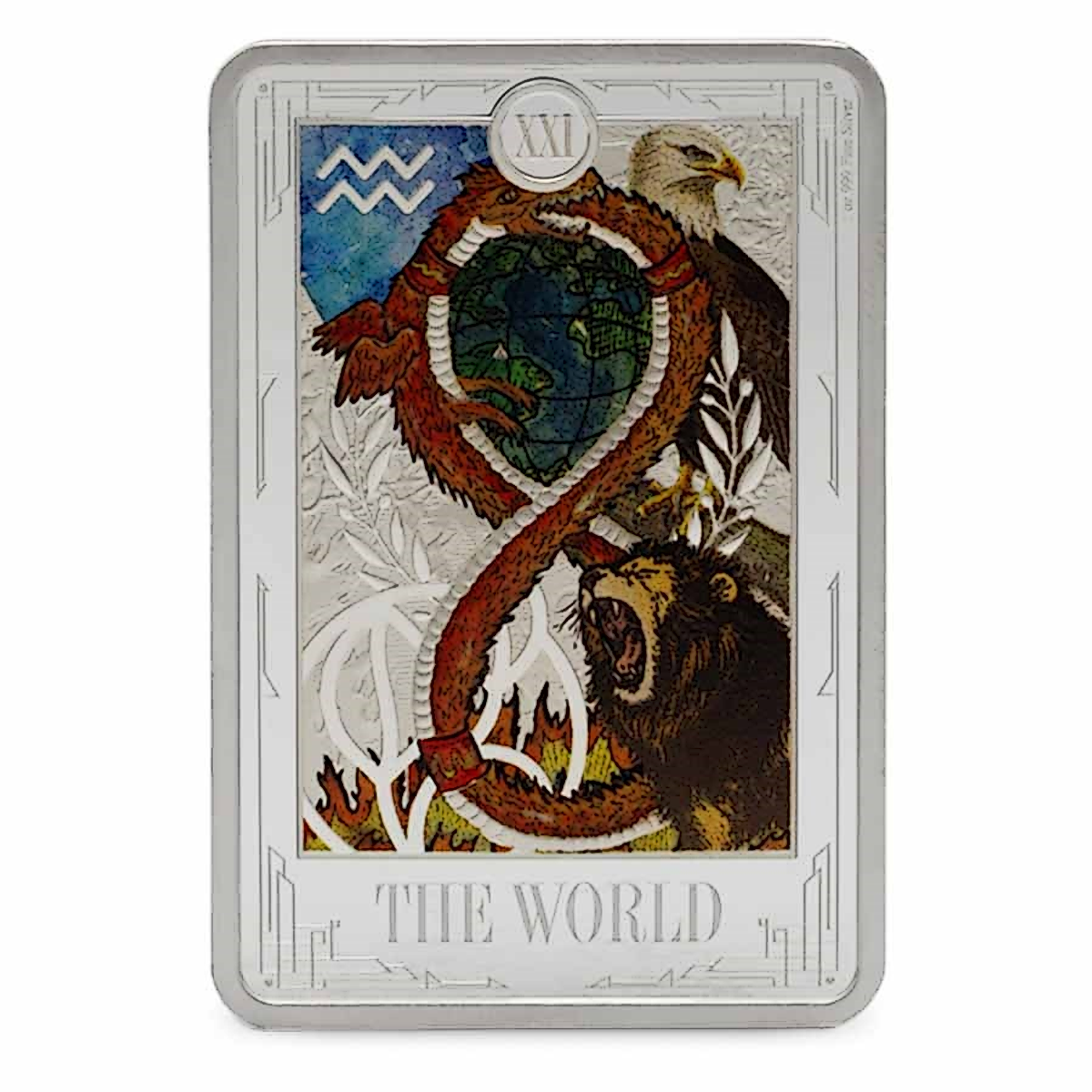 1 oz Silver The World tarot card silver bar minted by New Zealand Mint.