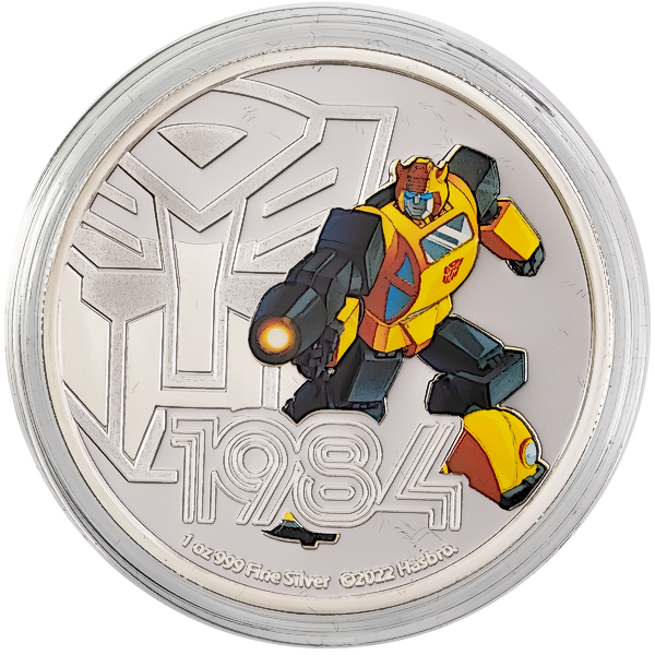 Based on the 1984 series, The Transformers, this round 1oz pure silver coin features Bumblebee, in full colour. It includes a mirror finish background, making the silver gleam! Engraved and frosted is The Transformers logo and the year 1984.