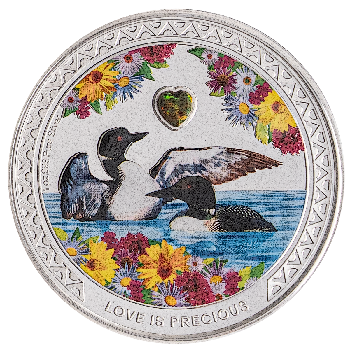 The reverse displays a colored design of two Great Northern Diver birds surround by bright flowers. The heart shaped gemstone matches the colors of the flowers. The inscription "Love is Precious" is engraved into an ornate border design at the bottom.