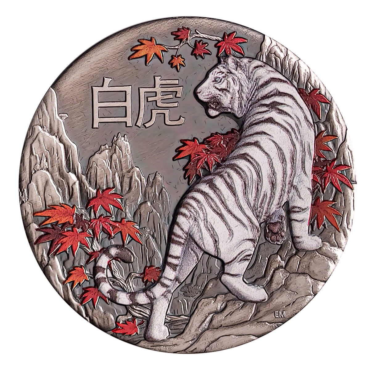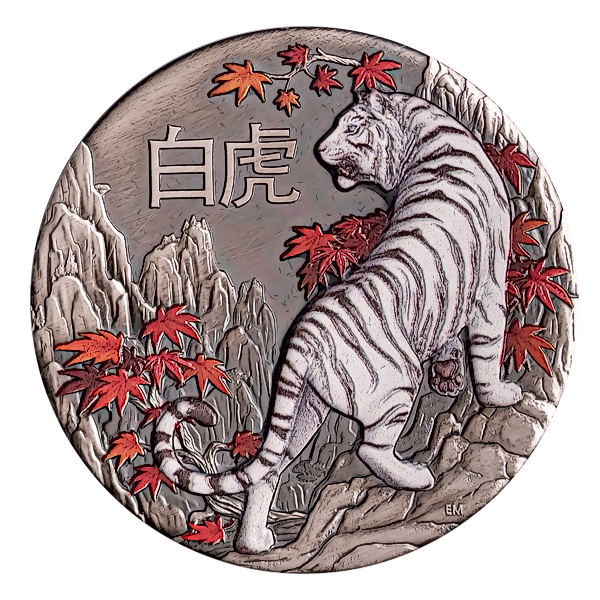 The front of the coin portrays a White Tiger climbing among mountainous peaks. This coin has been 'antiqued' by hand to give it a unique finish that resembles the surface abrasions of an ancient relic.