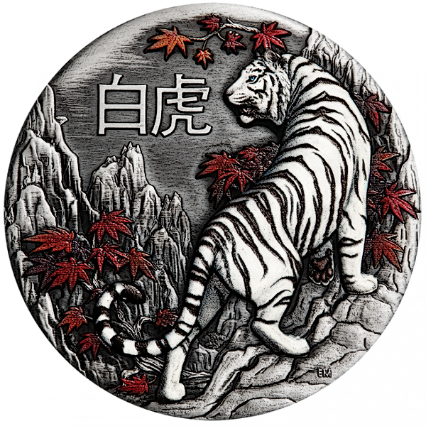 The front of the coin portrays a White Tiger climbing among mountainous peaks. This coin has been 'antiqued' by hand to give it a unique finish that resembles the surface abrasions of an ancient relic.