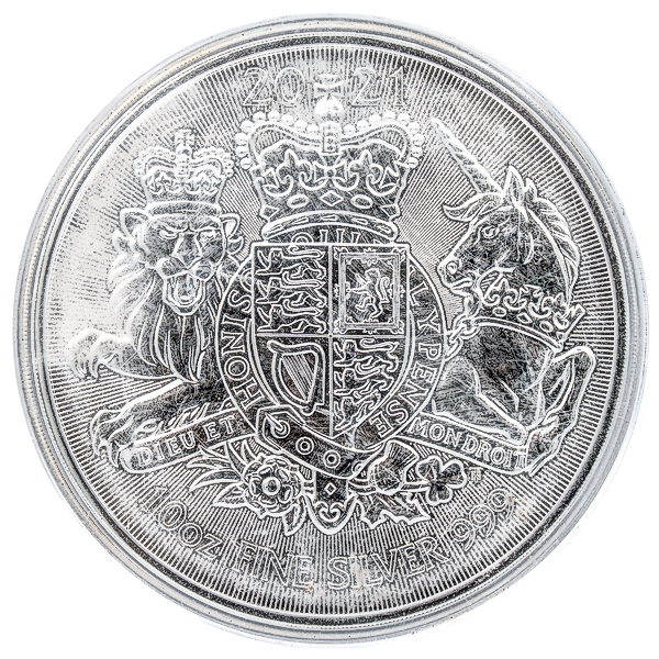 This 10 oz silver bullion coin from the Royal Mint is minted in 99.9% fine silver by Britain’s Royal Mint and celebrates British monarchy and heraldry.