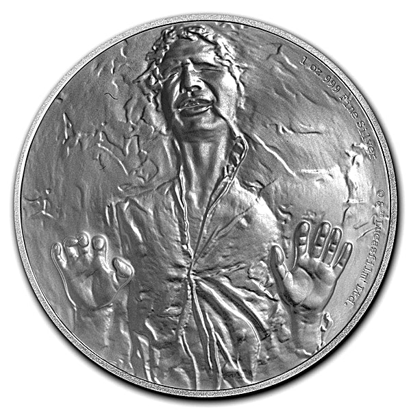 The reverse of the coin features Han Solo frozen in carbonite, as in the 1980 movie Star Wars: The Empire strikes back."
