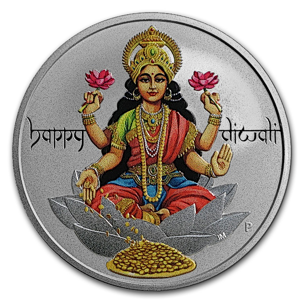 The coin's reverse depicts a colored representation of Lakshmi sitting on a lotus flower with Gold coins pouring out of her hands, symbolizing material and spiritual wealth. The design includes the inscription "Happy Diwali".
