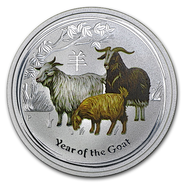The 8th coin of the popular Australian Lunar Series features a family of goats grazing. The Chinese character for "Goat" and the inscription of "Year of the Goat" also appears on the coin.