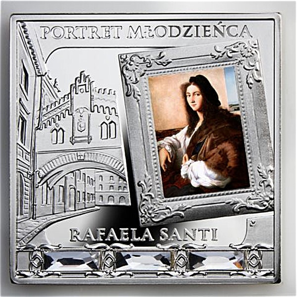 The obverse of the coin features the portrait of a young man, painted by Renaissance artist, Raphael Santi.