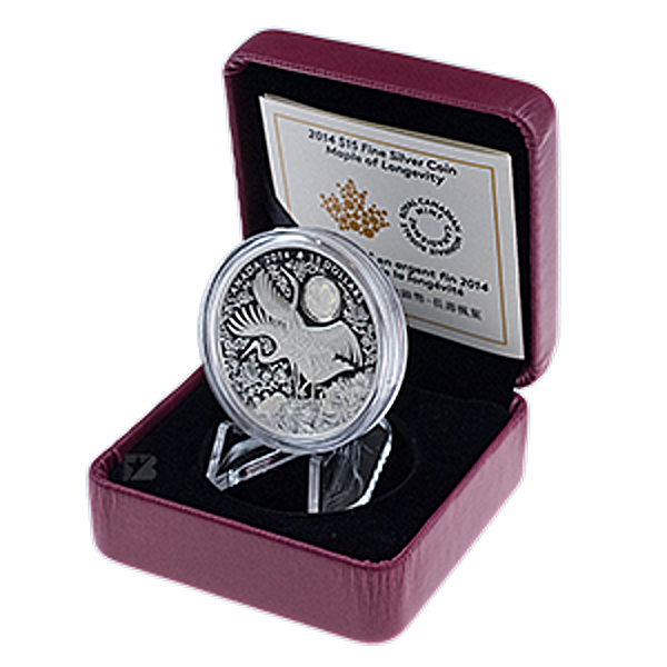 The coin is encapsulated and presented in a Royal Canadian Mint branded maroon clamshell case lined with black flock and protected by a black sleeve.