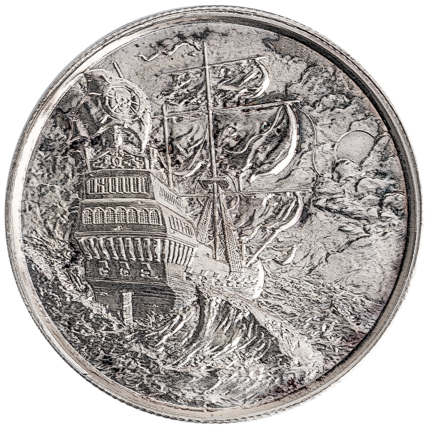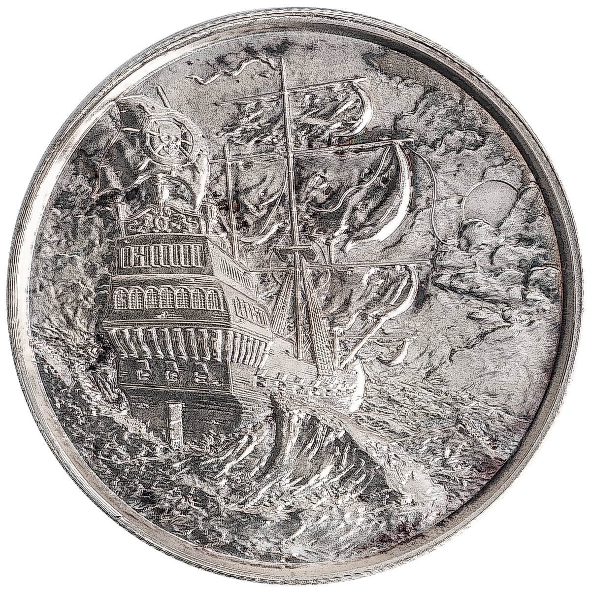 The obverse features a skull over a ship’s wheel, reminiscent of the Jolly Roger.