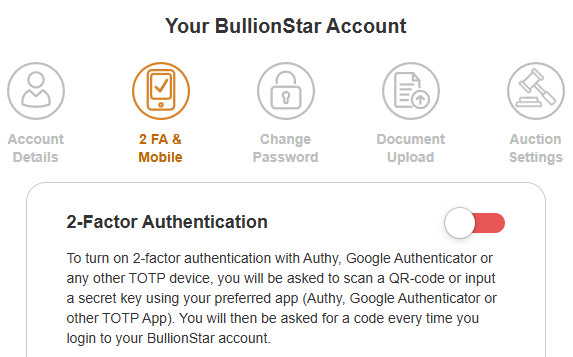 BullionStar strongly recommends you to enable 2-Factor Authentication as an additional layer of security to keep your BullionStar account secure.