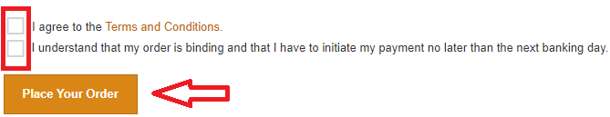 Step 8: Read the Terms And Conditions. If you agree, check the relevant checkbox. Then confirm that your order is binding by checking the acknowledgment box. Finally click "Place your Order" to submit your order.