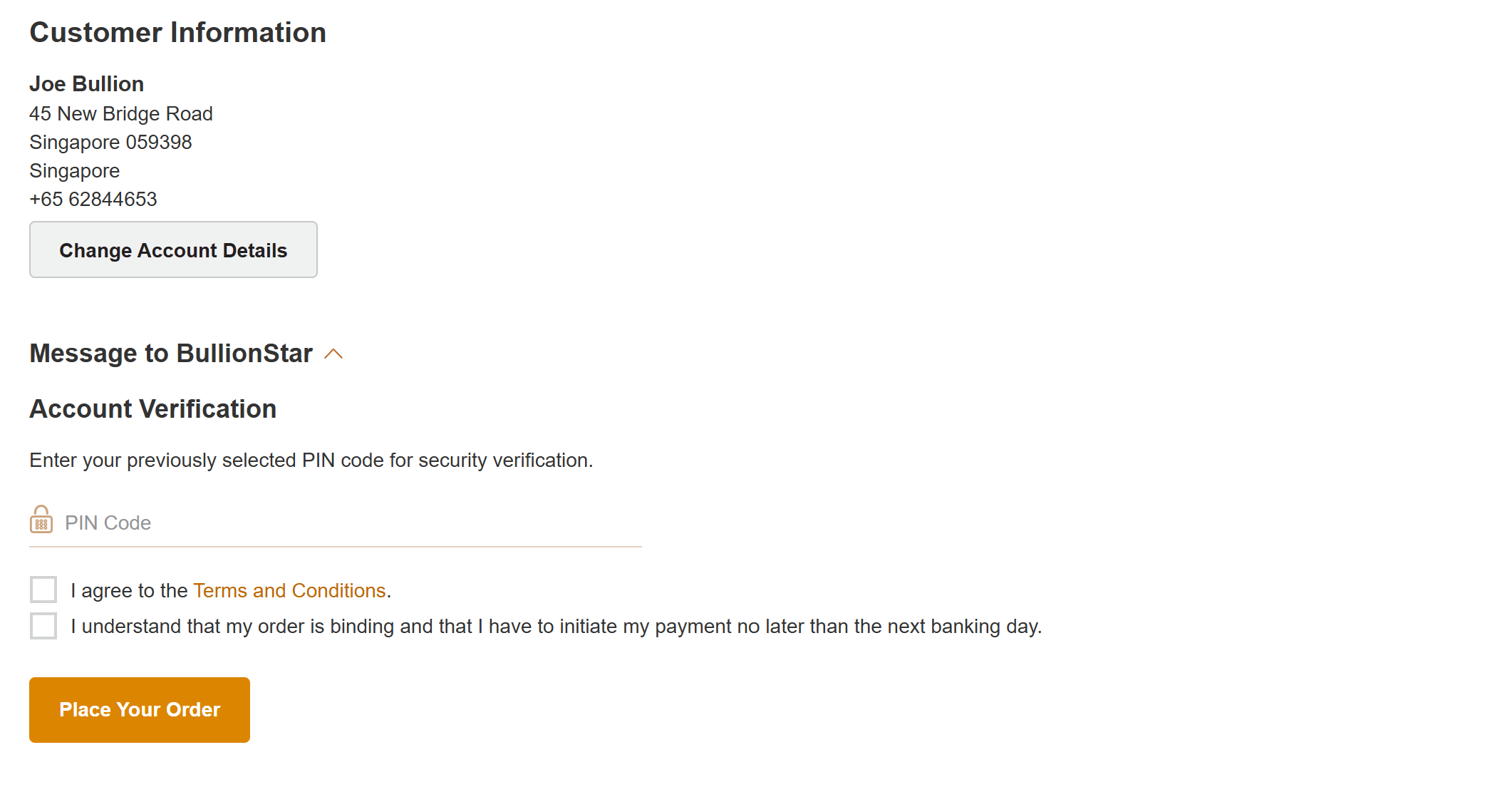 If you are yet to create an account, fill in the empty fields under "Customer Information". If you are logged out but have created an account previously, please login. If you are placing an order for Vault Storage for the first time, you will also have to select a PIN code which will be mandatory to enter in subsequent transactions. If you have previously selected your PIN code, input the PIN code under "Account Verification" if requested.