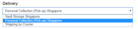 Step 5: Select delivery method by clicking on the drop-down box under Delivery using the the arrow on the right hand side. You can opt to have your purchased items stored in Vault Storage, personally collect (pick up) your products, or have your purchased items shipped to you by Courier.