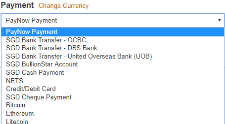 Note that you can change the currency you wish to pay in by clicking the "Change Currency'" link next to the Payment heading. Available currencies include SGD, USD, EUR, GBP, AUD, NZD, SEK, JPY, as well as the cryptocurrencies BTC, ETH, BCH and LTC.